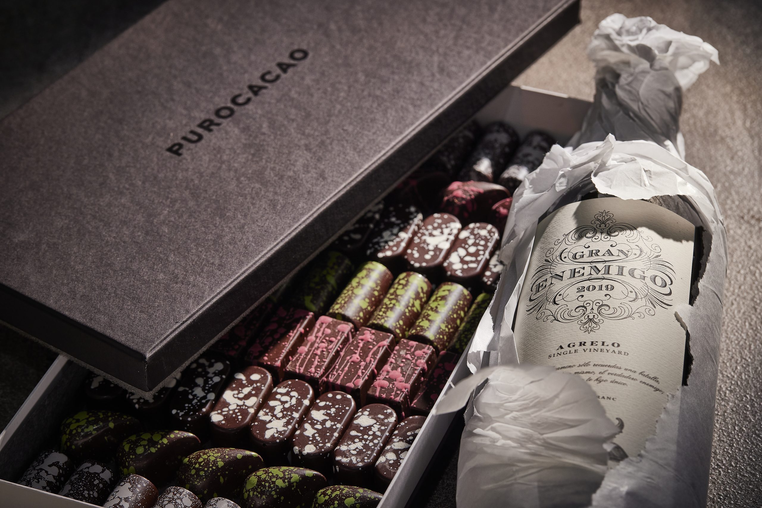 - Relleno: Bombones rellenos con ganache de chocolate y reducciones de vino de Agrelo, Gualtallary, Chacayes y Cepillo.