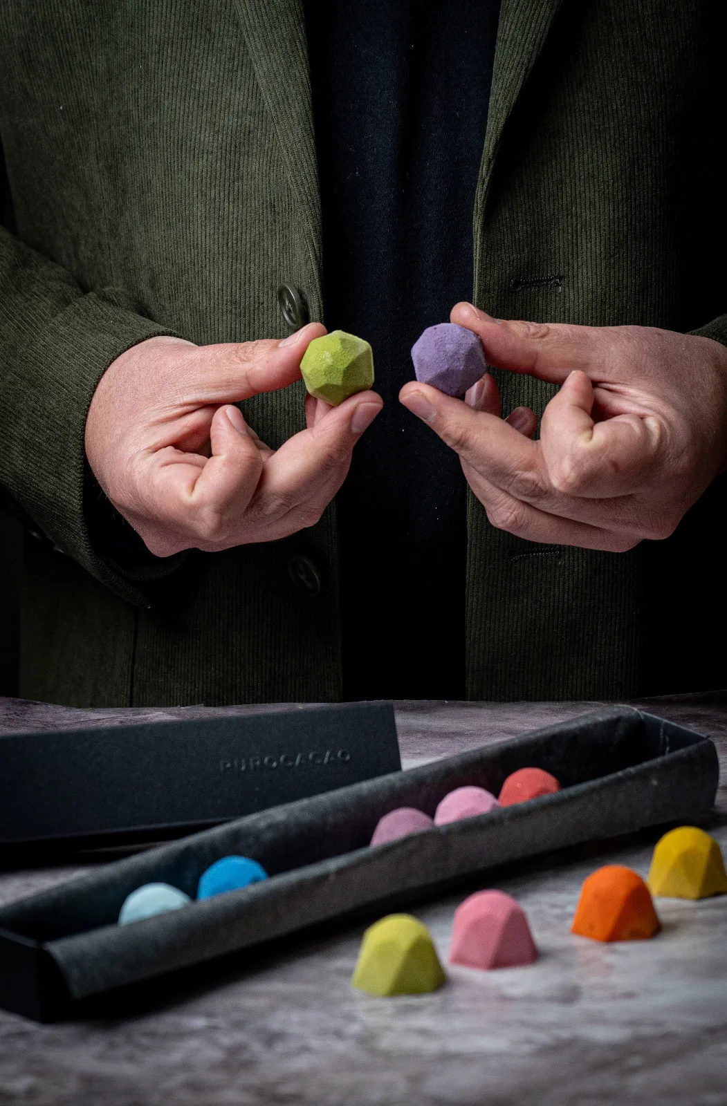 Sesenta bombones donde ganaches sedosas, frutas trabajadas con precisión y pralinés cremosos se envuelven en cacao orgánico 100% americano. Cada tono anticipa el sabor: del frescor cítrico del maracuyá a la elegancia floral del agua de rosas de Damasco.