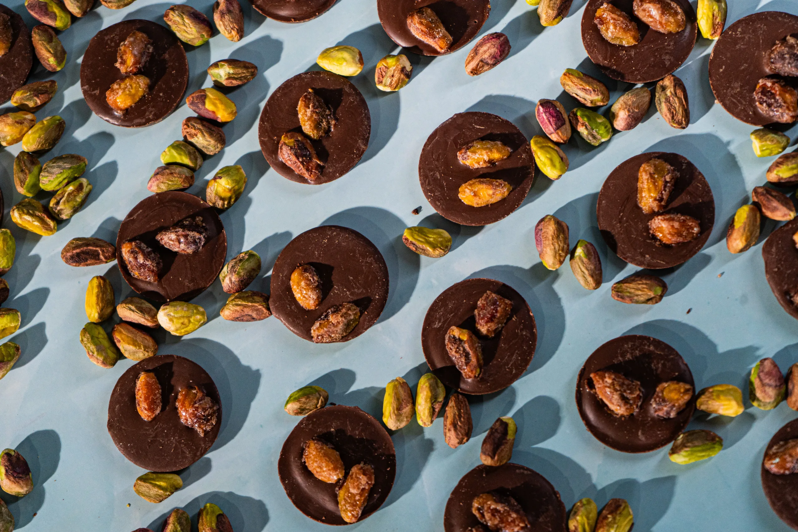 220 gramos con relleno de moneditas y pistacho caramelizado — dulzura tostada, textura que corta el cacao en el momento exacto.