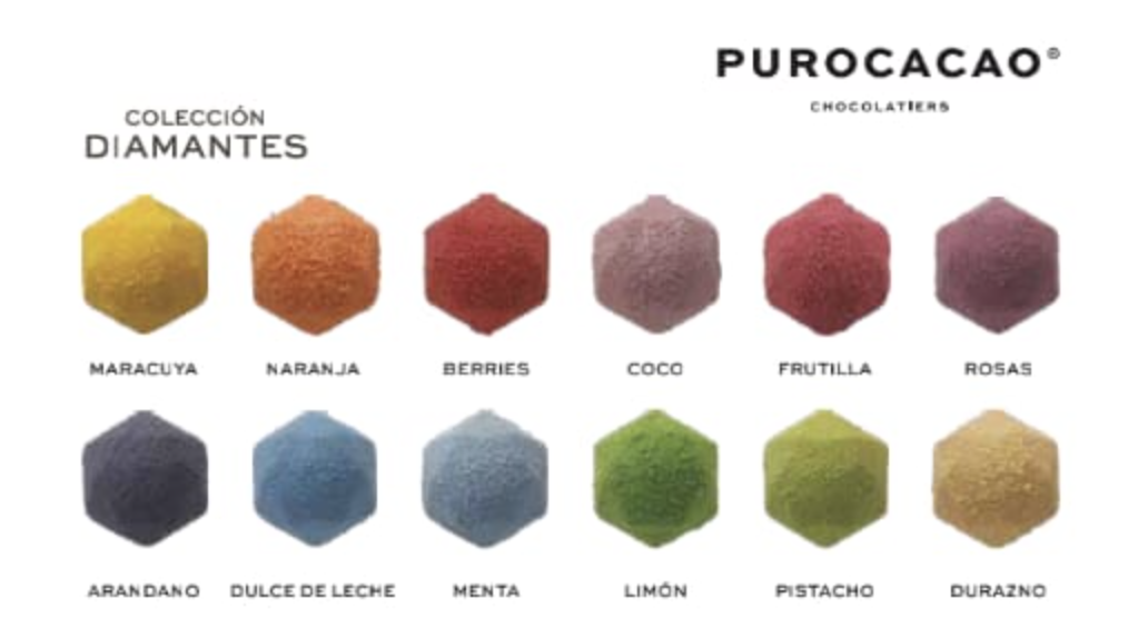 Rellenos: Maracuyá, Naranja, Frutos Rojos, Coco, Frutillas, Agua de Rosas, Arándanos, Dulce de Leche, Menta, Limón, Pistacho y Durazno