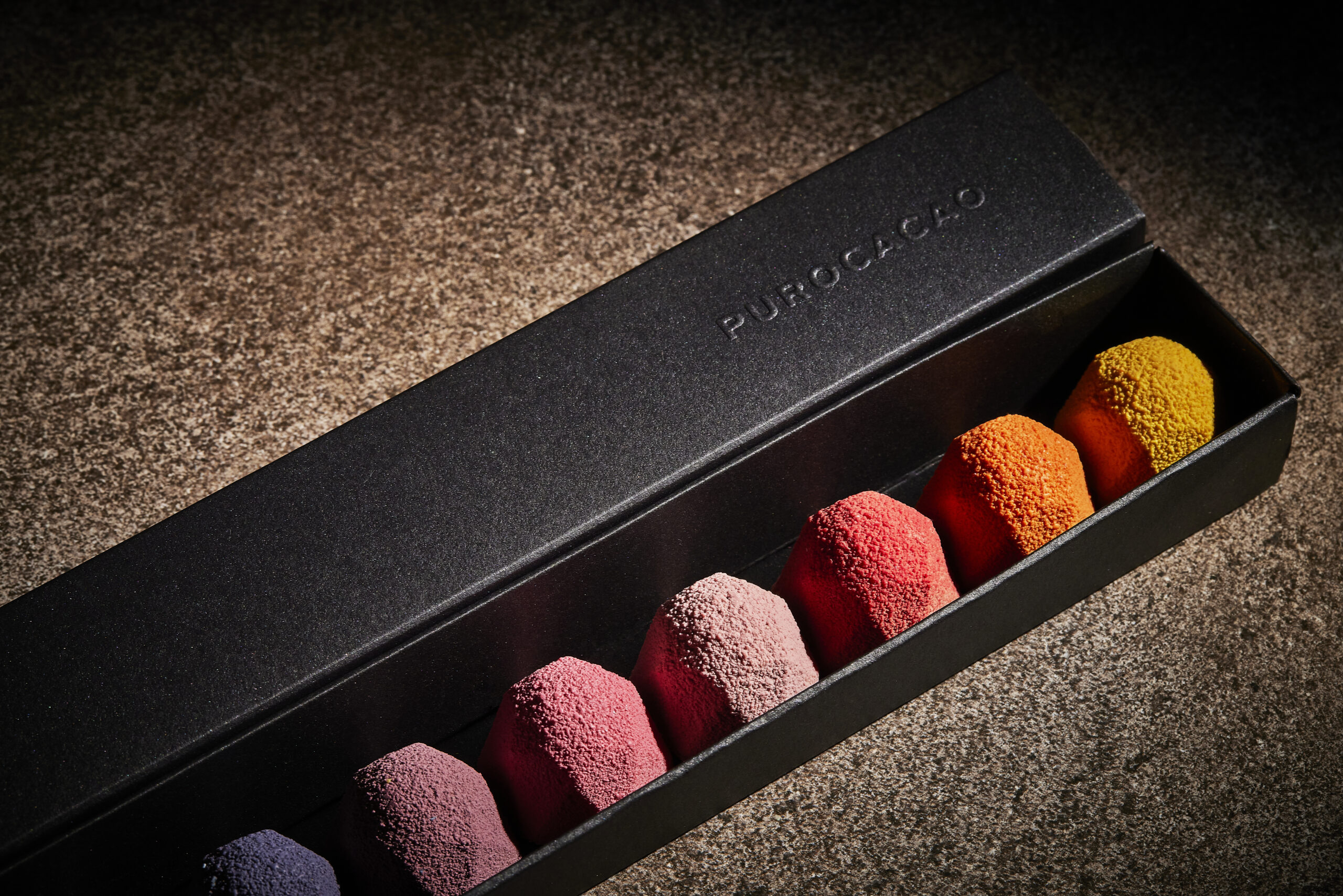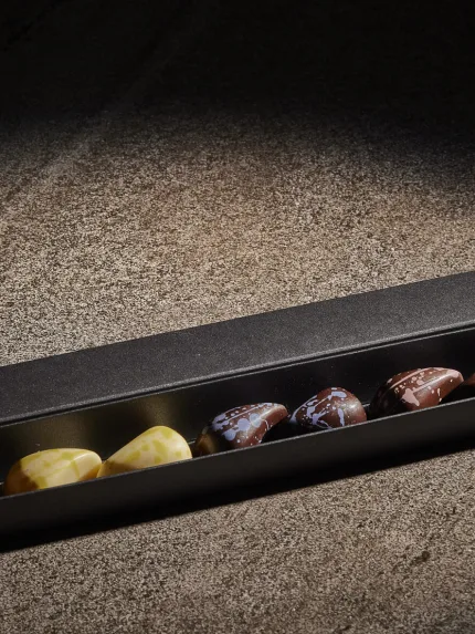 Noir Diamantes Velvet es la expresión más refinada de nuestra colección más suave y táctil. El estuche incluye 11 bombones cuidadosamente elaborados, donde ganaches sedosas, frutas precisas y pralinés cremosos se funden en un acabado aterciopelado.