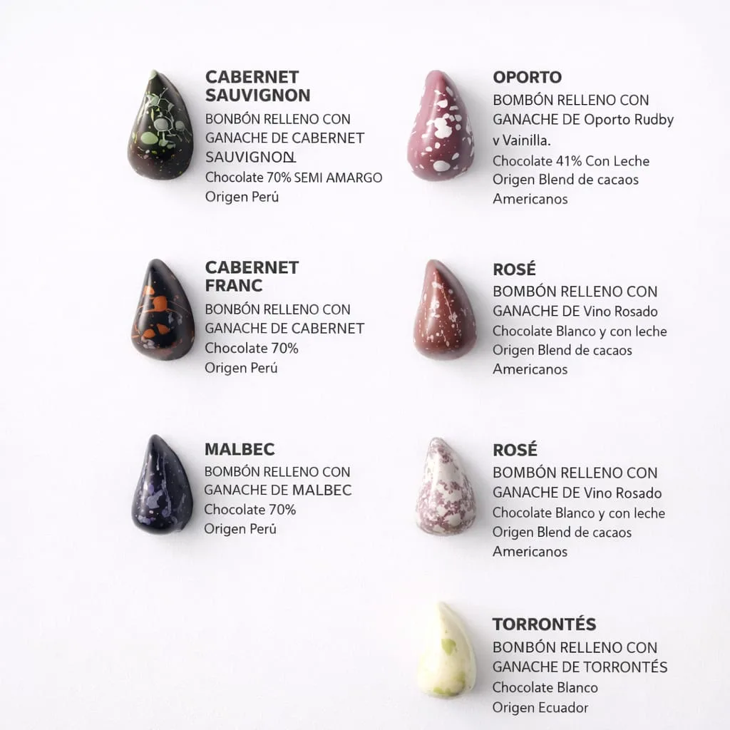 Rellenos: Ganache de chocolate con reducción de Malbec, Cabernet Franc, Torrontés, Cabernet Sauvignon y Oporto