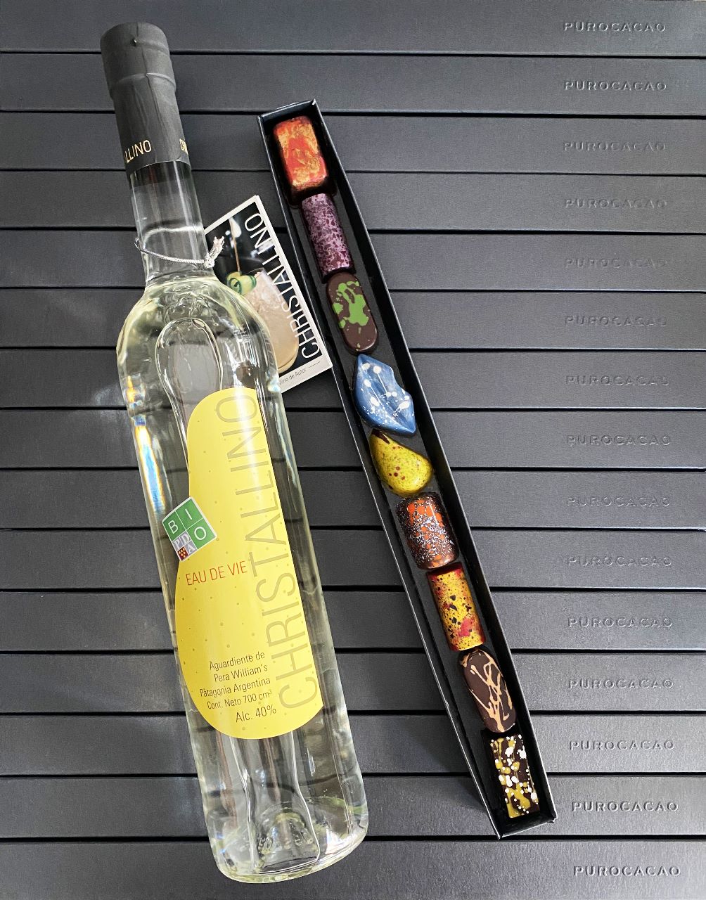 El set se completa con una agua de vida de peras Williams, producida artesanalmente en la Patagonia (Río Negro), que aporta frescura, pureza y una nota frutal elegante al conjunto.