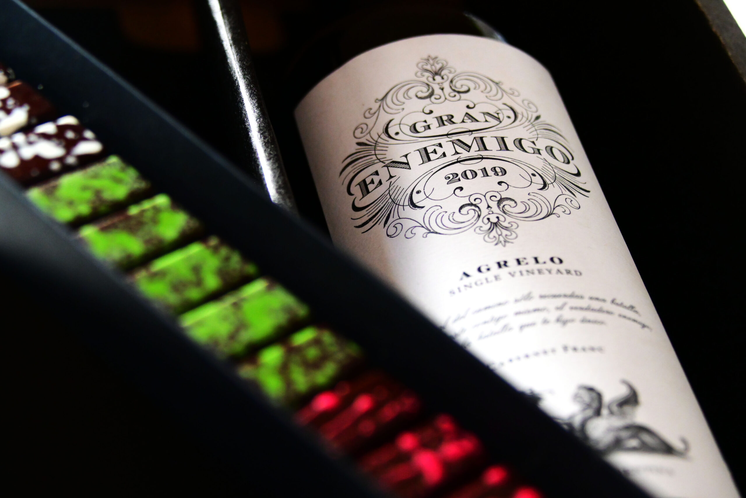 SET NOIR + GECF contiene una botella de Gran Enemigo y una caja NOIR de bombones rellenos con una ganache de chocolate de cada uno de los terruños de este gran vino que refleja la pasión y la búsqueda de la excelencia.